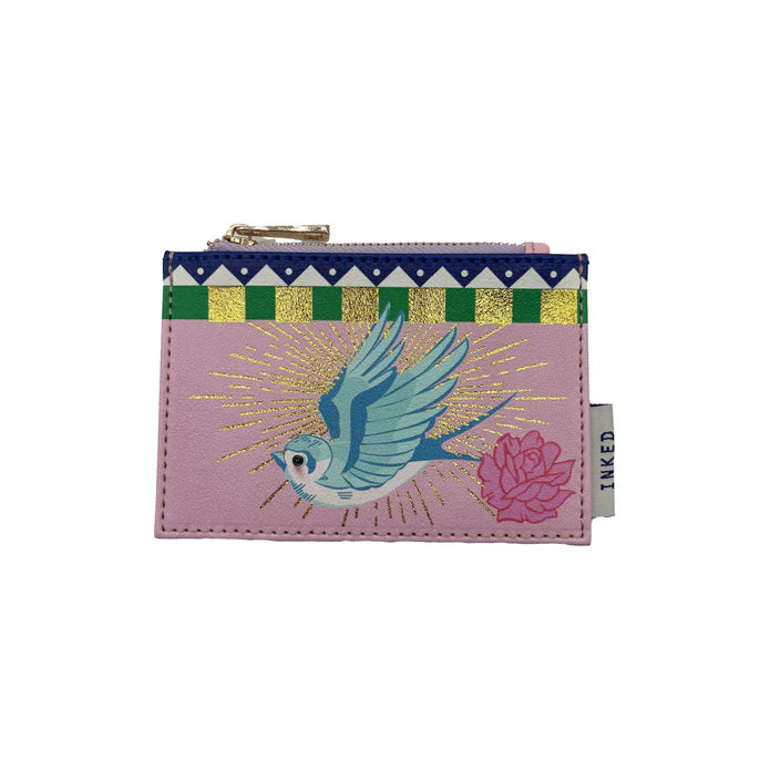 An ink inspired purse with a traditional tattooed swallow motif. With gold foil and geometric details, featuring a modern colour palette. The back depicts soft floral imagery with more gold touches. With a soft leather-like feel, a secure zipped pocket, and 4 card slots, this purse will keep your cash secure with a little edge! Perfect for any inked lover!