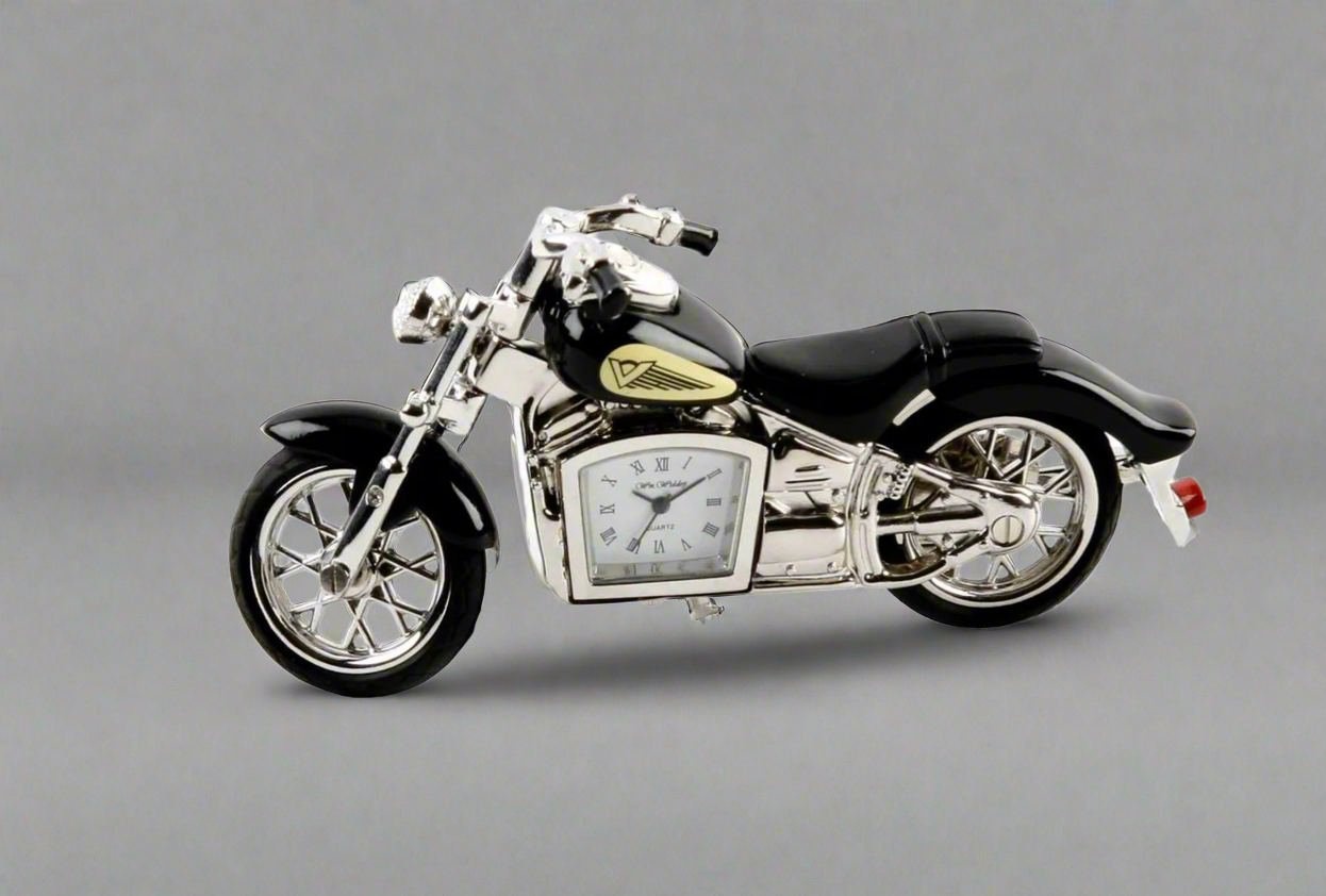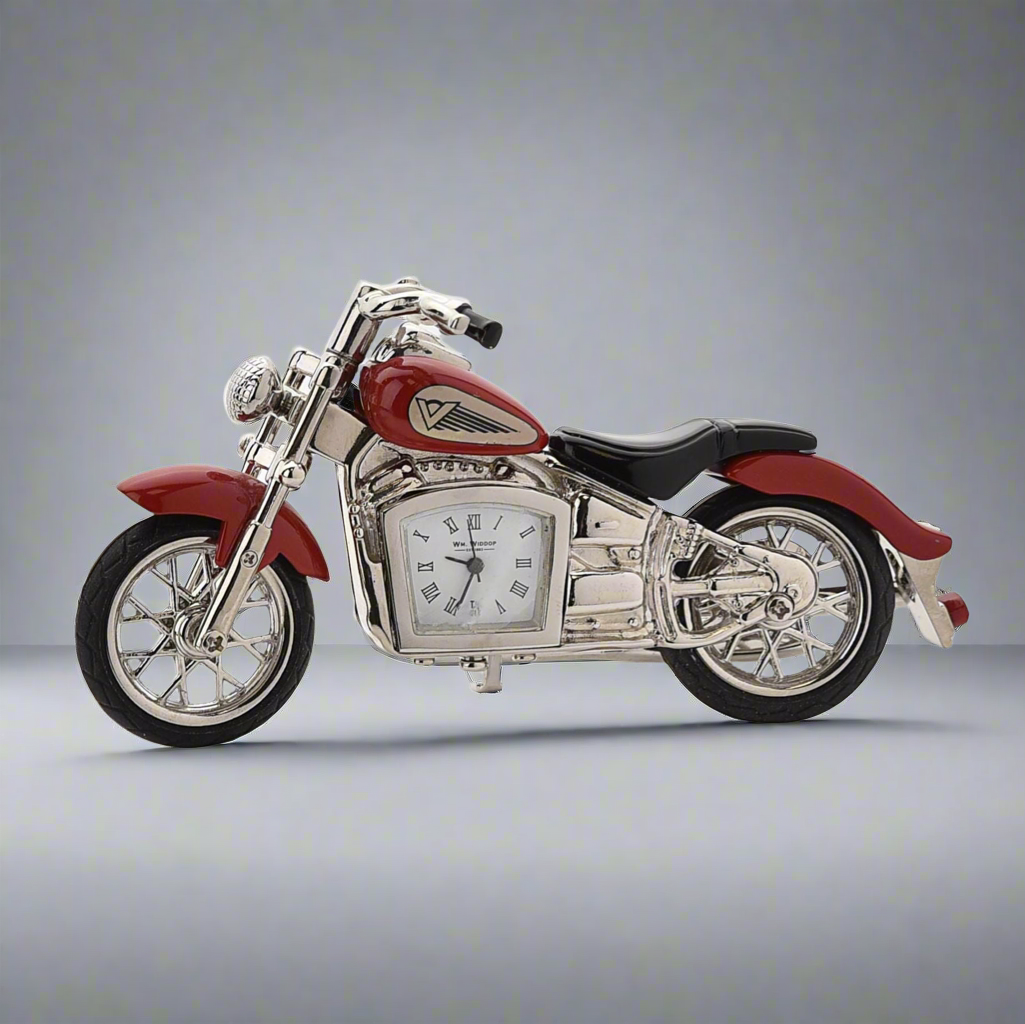 A red motorbike miniature clock from WILLIAM WIDDOP®. This dazzling motorbike clock has a lasting style that would complement any bedside table or living room mantelpiece. The clock design showcases significant attention to detail. The clock face is set within the motorbike's body, complemented by an attractive Roman numeral dial and slimline contemporary clock hands.