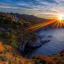 This beautiful card of Prussia Cove, Cornwall, shows the sun peaking over the hills.