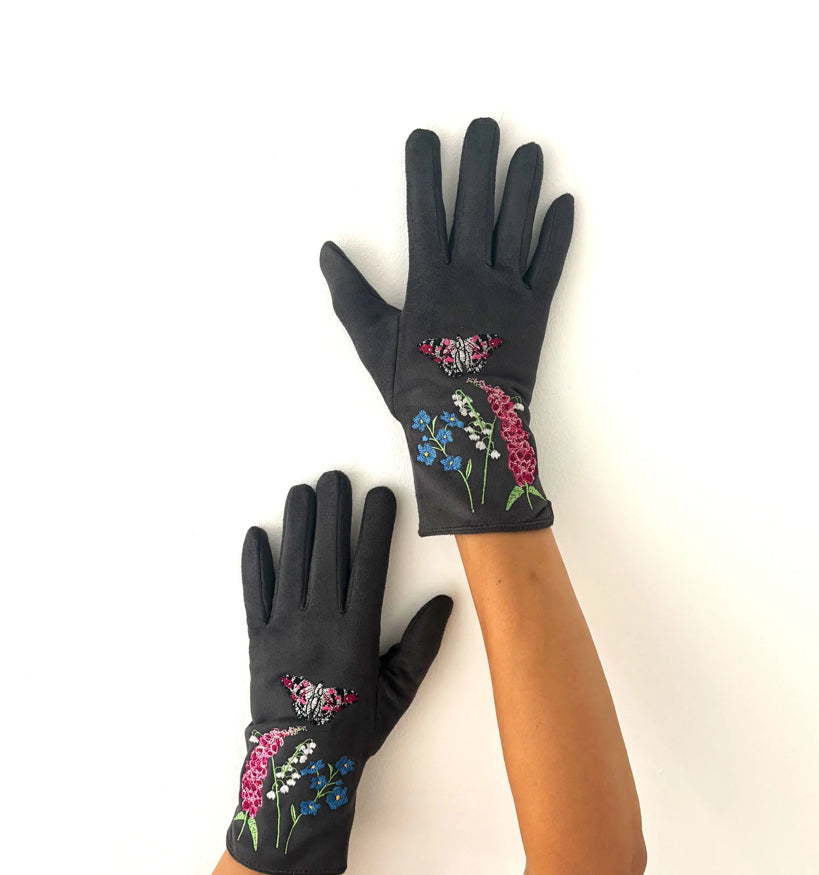 Let dappled afternoons and the charm of the English garden inspire your style this season with these gorgeous gloves. These lovely accessories feature an intricately embroidered butterfly design, surrounded by foxgloves and wispy wild cornflowers. Coming in a suedette fabric, in plush hues of dark grey, these are made easy to pair with any outfit. They are super soft and are the cutest gloves to keep your hands toasty warm this winter!